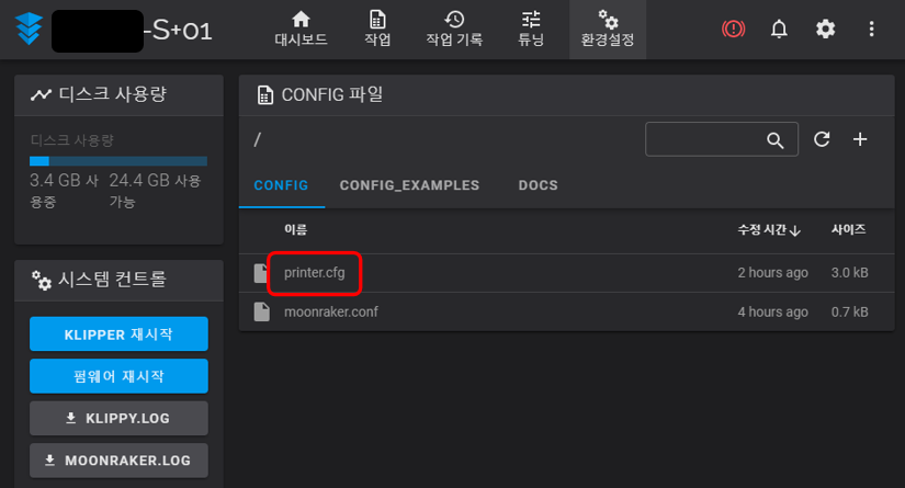 이유는 클리퍼로 옮기면서 printer.cfg 기능을 정의(아래 E-1 참고)해 놓지 않아서이다.
